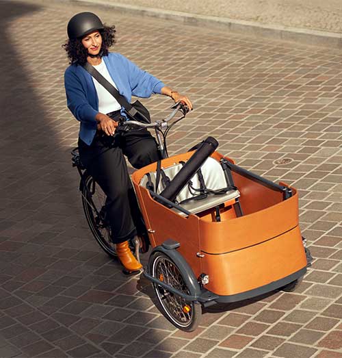 Eine Frau fährt mit einem Lastenrad.